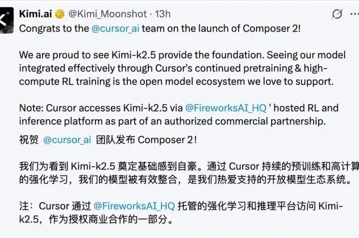 一个凌晨的帖子让AI圈坐不住了。估值近300亿好意思元的好意思国AI明星公司Cursor刚刚发布“新一代自研模子”,第二天就被发现后台履行在用中国开源模子Kimi K2.5。