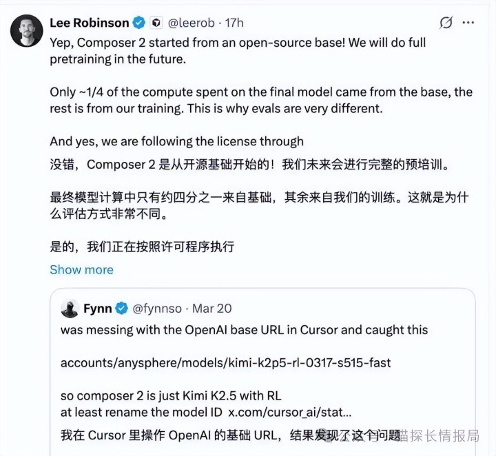 Cursor临了俯首认错,居品阐述东谈主Lee Robinson承认“毅然,莫得实时签字”,明白四分之三的模子靠自家磨练,剩下那一部分是Kimi打底。