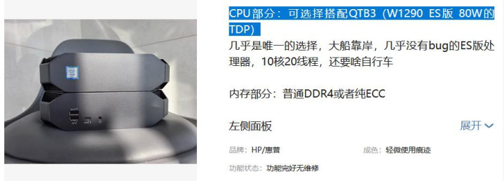 卖家挑升提到了CPU部分,可以采用搭配QTB3,也即是W1290的ES版措置器。这玩意儿确乎是近期大船停靠的产品,10核20线程,80W的TDP,要道是真实莫得bug,踏实性在ES版里算口角常能打的。若是加上这块U,整套下来的本钱简略在一千出面。
